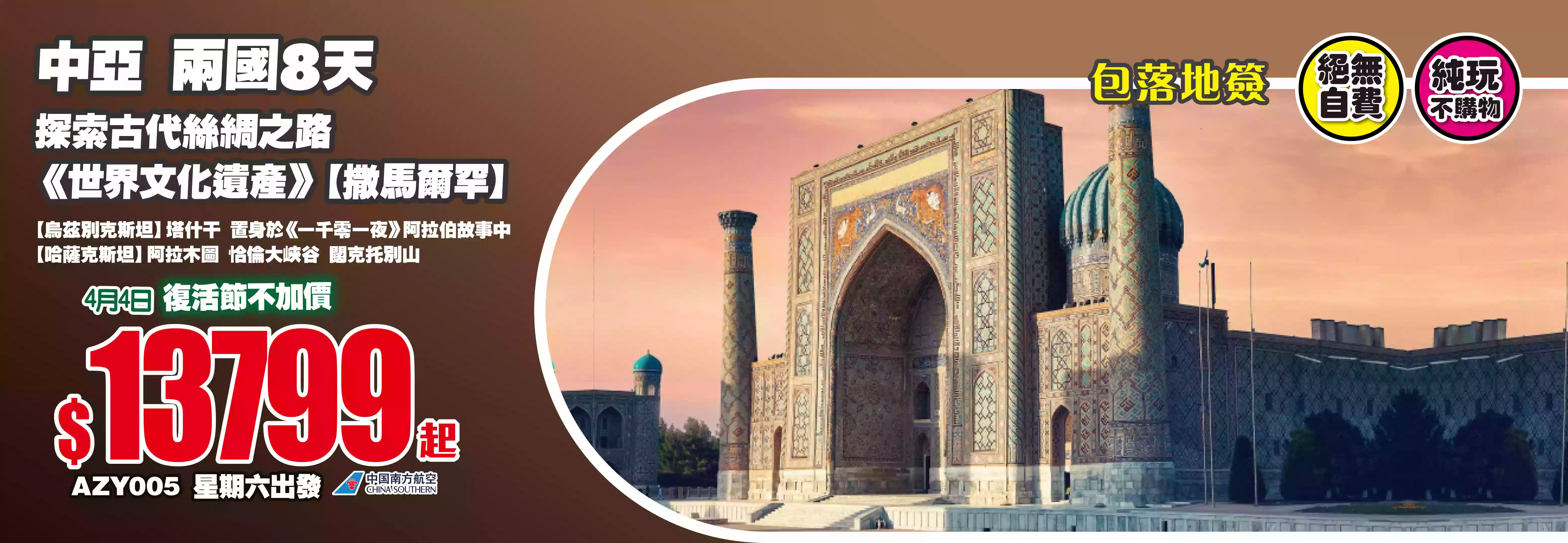 ![[AZY005]中亞兩國 【烏茲別克斯坦】【哈薩克斯坦】 探索古代絲綢之路《世界文化遺產》【撒馬爾罕】飛機純玩8天之旅](http://res.gdtour.hk/upload/default/2026/02/09/143457-32rwelto.vx2.png)